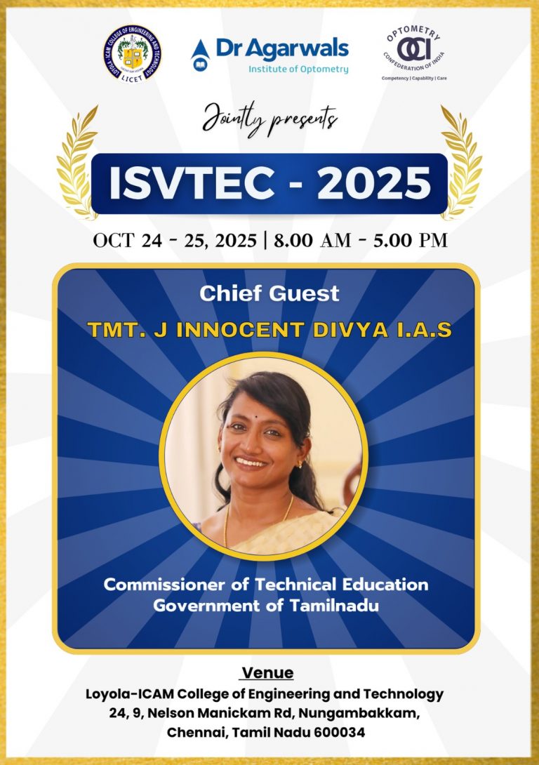 The ISVTEC – 2025 conference aims to bring together researchers, practitioners, and industry experts to explore cutting-edge innovations in the intersection of intelligent systems and vision technologies for enhancing eye care solutions. With the theme “Technology in Eyecare”, the conference will serve as a platform for presenting novel research, sharing clinical insights, and discussing the latest advancements in areas such as Computer Vision, Medical Imaging, AI in Ophthalmology, Smart Devices, Assistive Technologies, Tele-Ophthalmology, and Real-Time Vision Systems. The event will feature keynote sessions by leading experts, technical paper presentations, and interactive workshops.